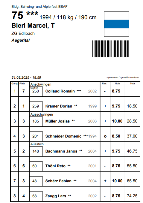 Der dritte Gang von Noe musste, wie bereits der erste, unterbrochen werden und endete gegen Jonas Wüthrich mit einer erneuten Niederlage. Das Knie ist noch zu wenig stabil und Noe musste den Wettkampf beenden. Wir wünschen dir gute Besserung. Marcel Bieri siegte bereits in der ersten Minute gegen Josias Müller. In Gang vier bekam unser Eidgenosse einen starken Gegner zugeteilt. Der Edlibacher unterlag dem Ostschweizer Schwergewicht Domenic Schneider und schloss den Tag mit 37 Punkten ab.